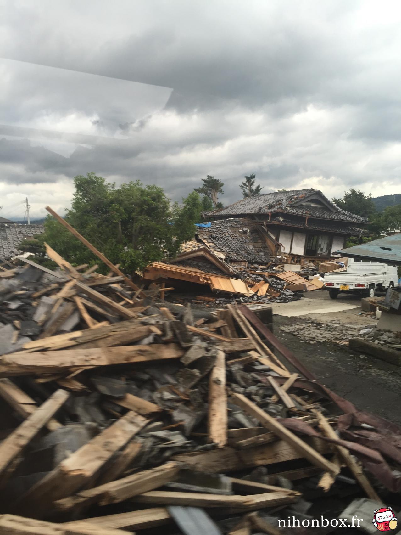 Le reste du terrible tremblement de terre qui a secoué la ville de Kumamoto, nous n’y sommes passés que brièvement en bus, mais c’était vraiment impressionnant et triste de voir des quartiers résidentiels complètement détruits.