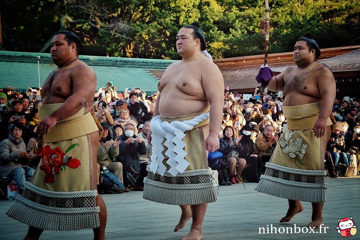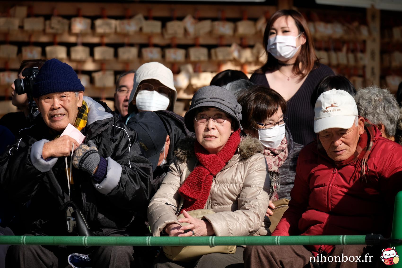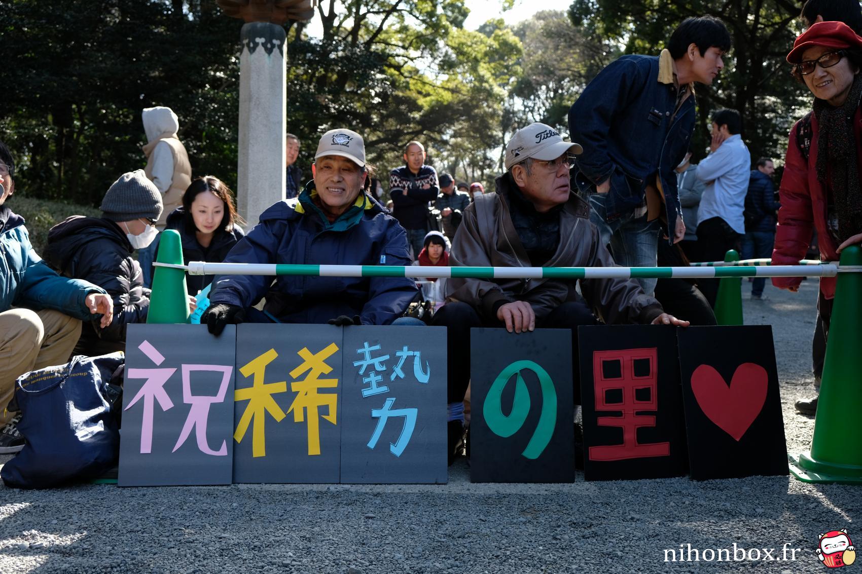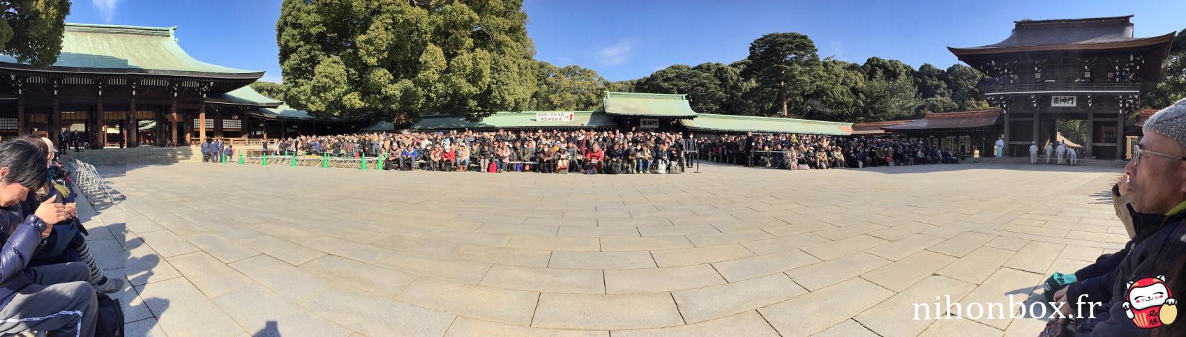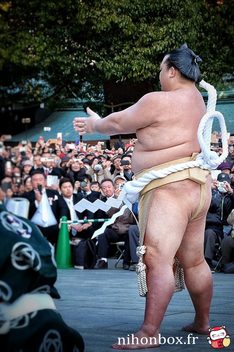 Au total 18000 personnes ont formé une gigantesque file sur le chemin de Menji Jingu, on faisait heureusement partie des premiers ! L'attente est passée relativement rapidement, à discuter avec les autres personnes ou à aller faire des photos autour du sanctuaire (on pouvait quitter la file d'attente un peu comme on voulait). On a forcément eu des bonnes places, même si Kisenosato était de dos pendant son dohyou-iri