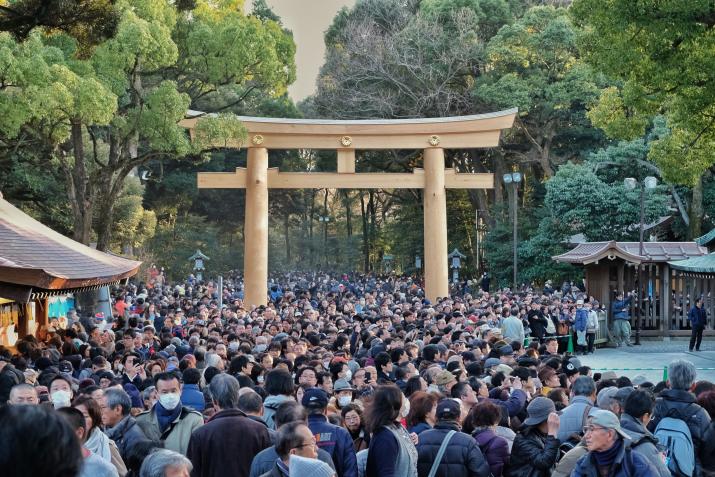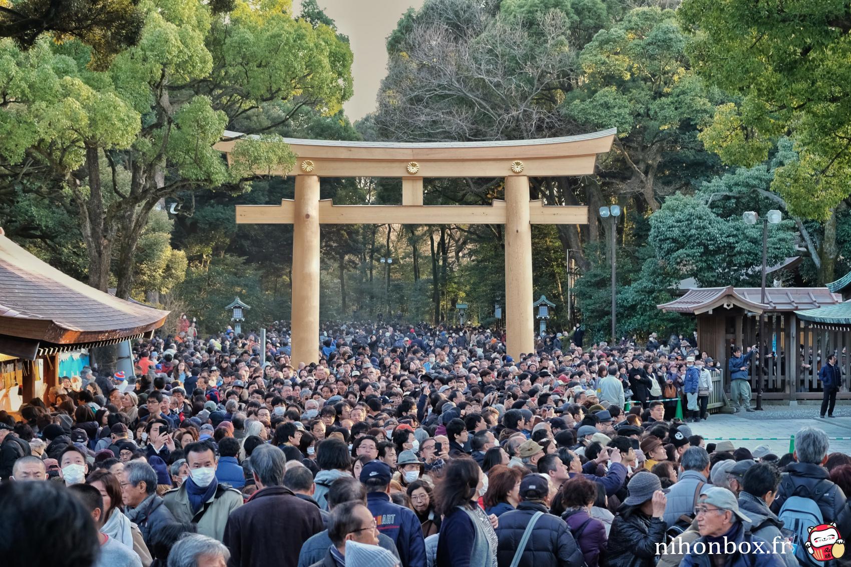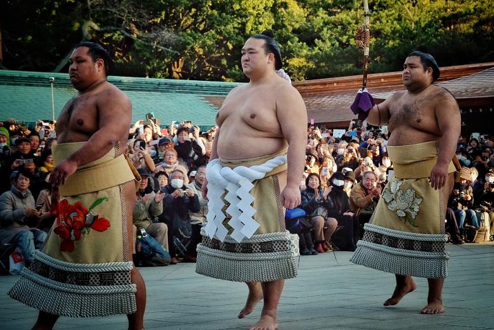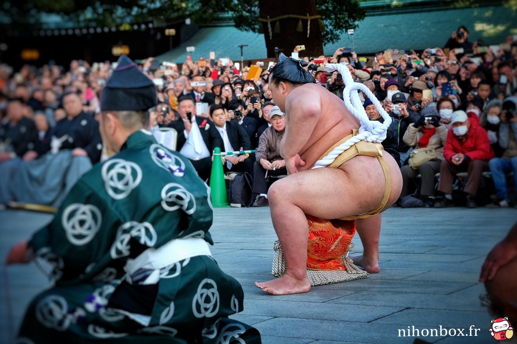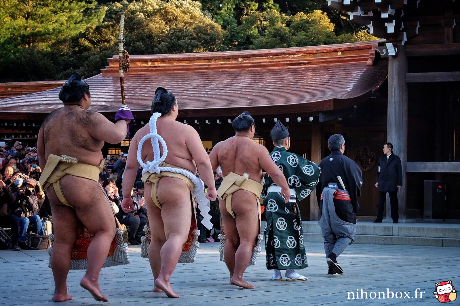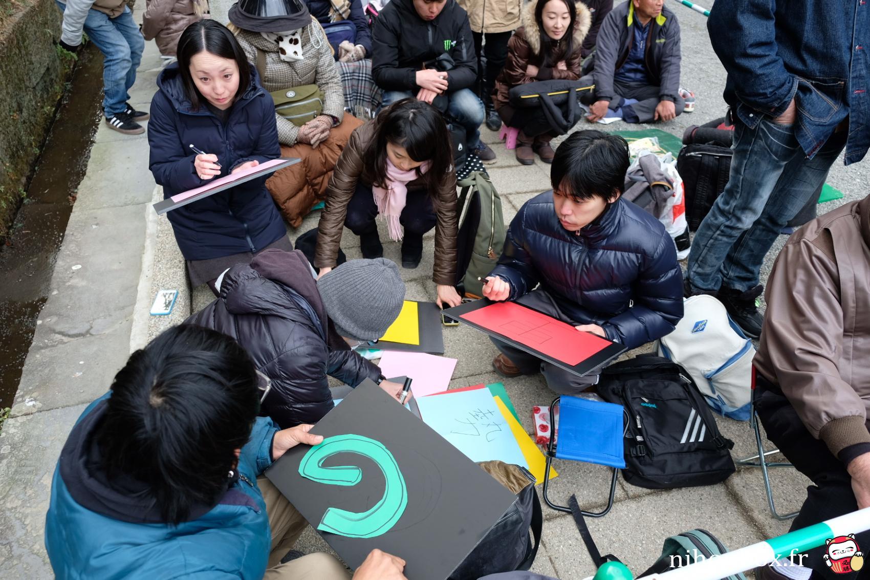 Au total 18000 personnes ont formé une gigantesque file sur le chemin de Menji Jingu, on faisait heureusement partie des premiers ! L'attente est passée relativement rapidement, à discuter avec les autres personnes ou à aller faire des photos autour du sanctuaire (on pouvait quitter la file d'attente un peu comme on voulait). On a forcément eu des bonnes places, même si Kisenosato était de dos pendant son dohyou-iri