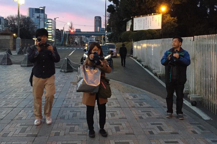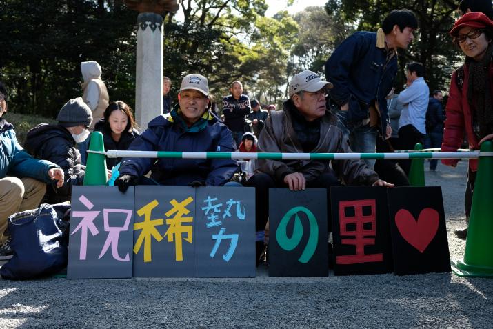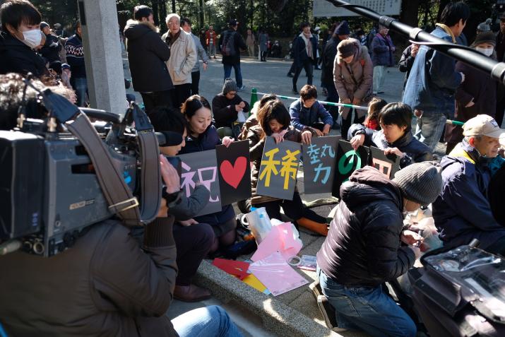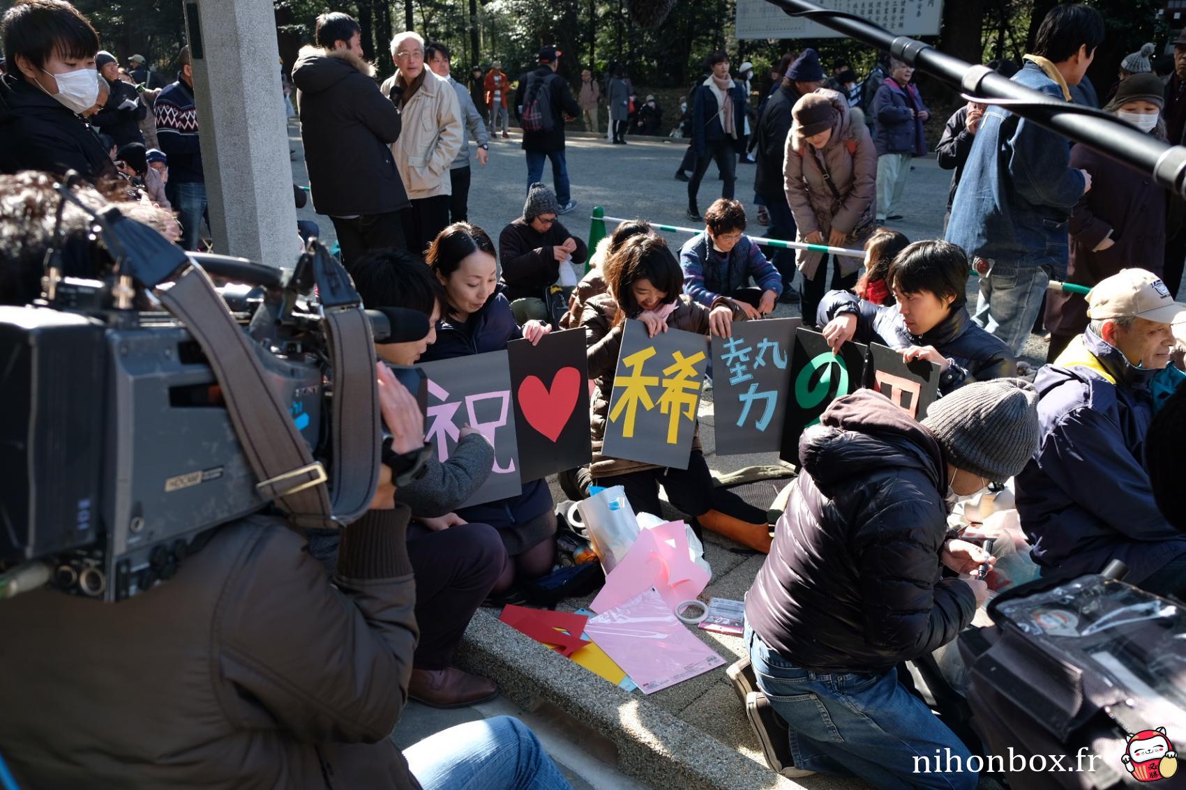 Pour la cérémonie au Meiji Jingu, suite à notre échec quelques jours plus tôt, nous n’avons pas fait les choses à moitié. Pour être sûr d'avoir une bonne place dans le sanctuaire, pour faire des photos et assister au plus près à cet événement rare, nous sommes arrivé à 5h40, la cérémonie débutait à 15h00. Oui, je crois que le Japon rend fou. A cette heure là, les journalistes de toutes les TV étaient présents pour immortaliser la file d'attente.