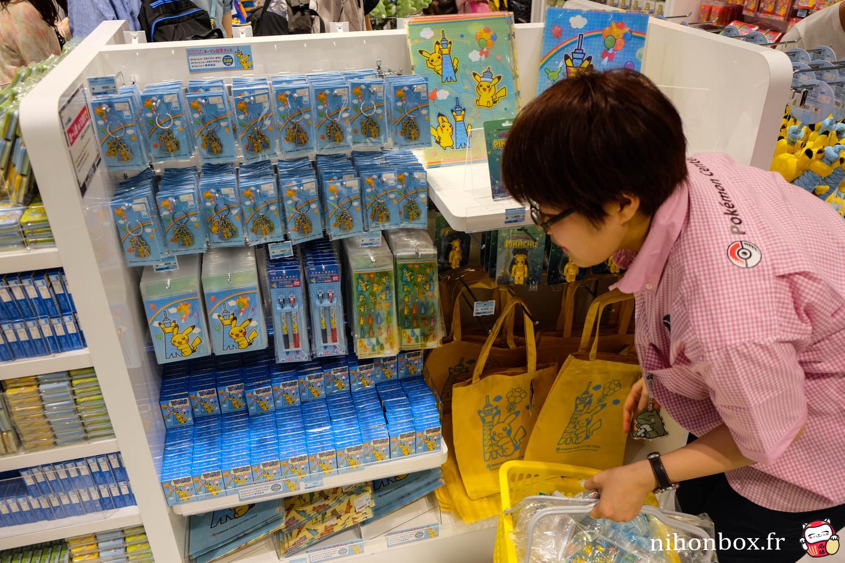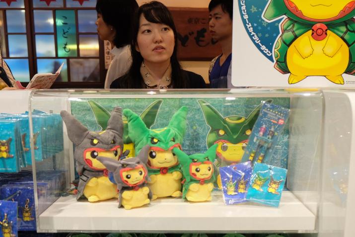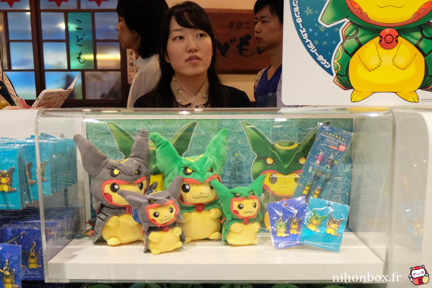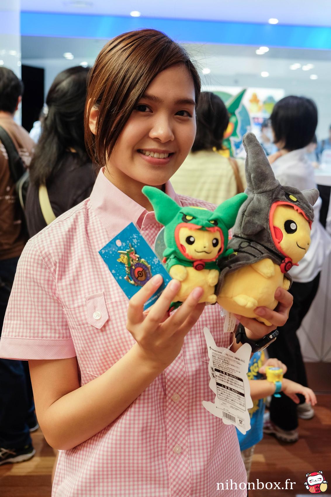 A l’intérieur de cette grande boutique, un monde fou, des paniers plein de goodies et une grande file d’attente pour arriver jusqu’à la caisse. La mascotte de ce Pokémon Center est le Pokémon Rayquaza, accompagné de Pikachu, il y avait donc pas mal de produits dérivés exclusifs à l’effigie de ces personnages. Pour pousser à l’achat des petits cadeaux étaient offerts, par exemple un porte-clés par tranche de 4000 yen d’achat. Pikachu était bien sûr présent en personne pour assurer le show auprès des fans, on peut dire qu’il a réussi sa mission.