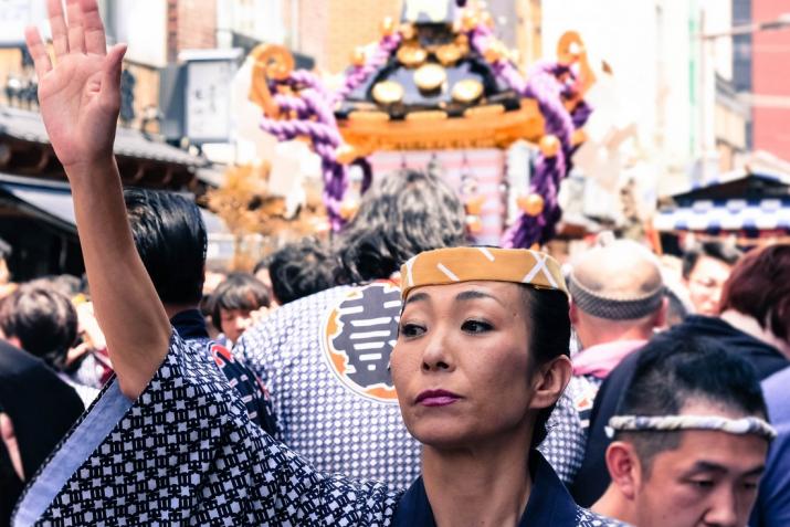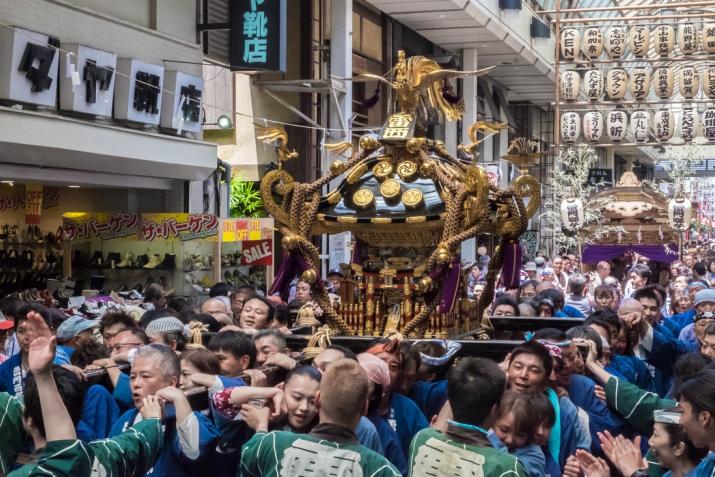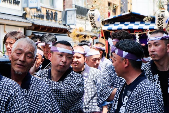 Dès la sortie du métro, on peut déjà sentir que le quartier est en fête avec de nombreuses personne dans les rues mais aussi des Mikoshi ! Les Mikoshi sont de petits temples portatifs que les participants transportent avec un engouement fou dans toutes les rues du quartier. Pour le Sanja Matsuri, une centaine de Mikoshi sont portés un peu partout dans Asakusa. Ces petits temples portatifs sont très lourds, plusieurs centaines de kilos, il faut donc des dizaines de personnes pour en soulever un seul et ça se voit sur le visage des festivaliers, qui crient pour s’encourager et se donner le rythme.